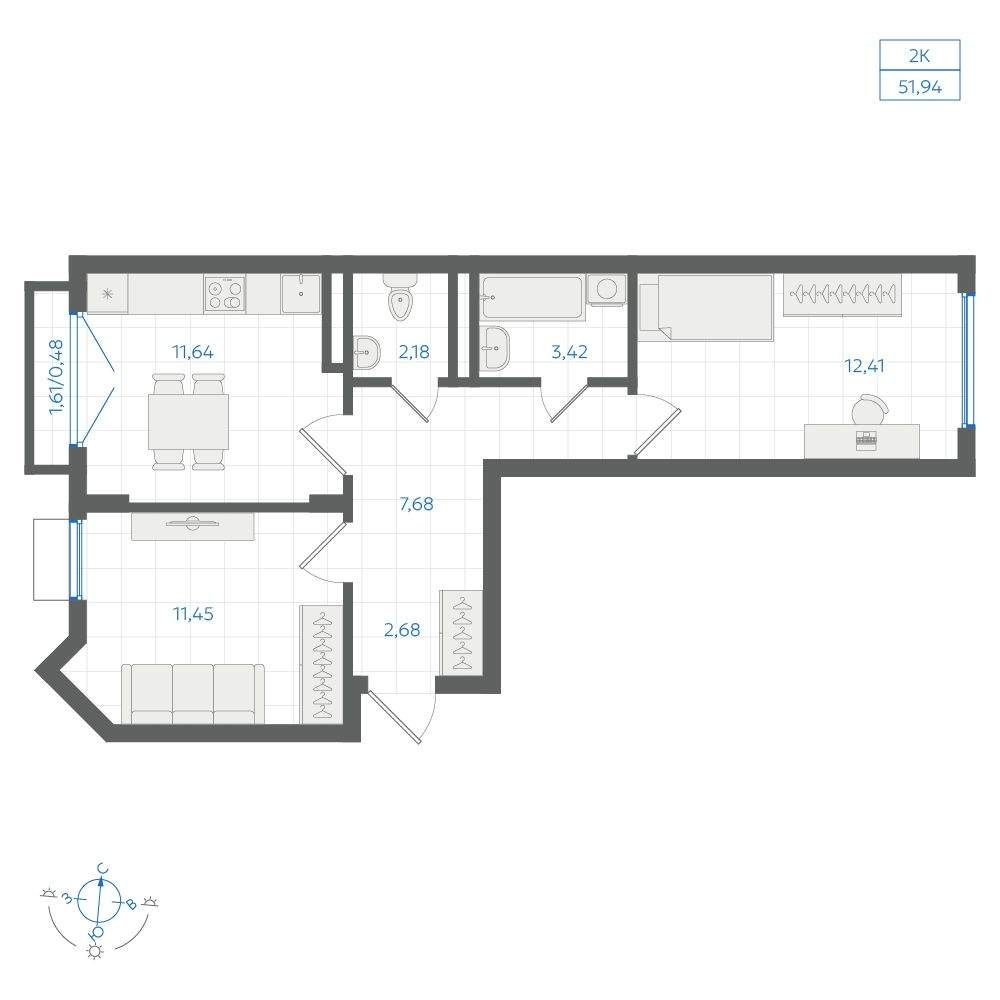 Продам двухкомнатную квартиру в новостройке 51.9 м.кв.