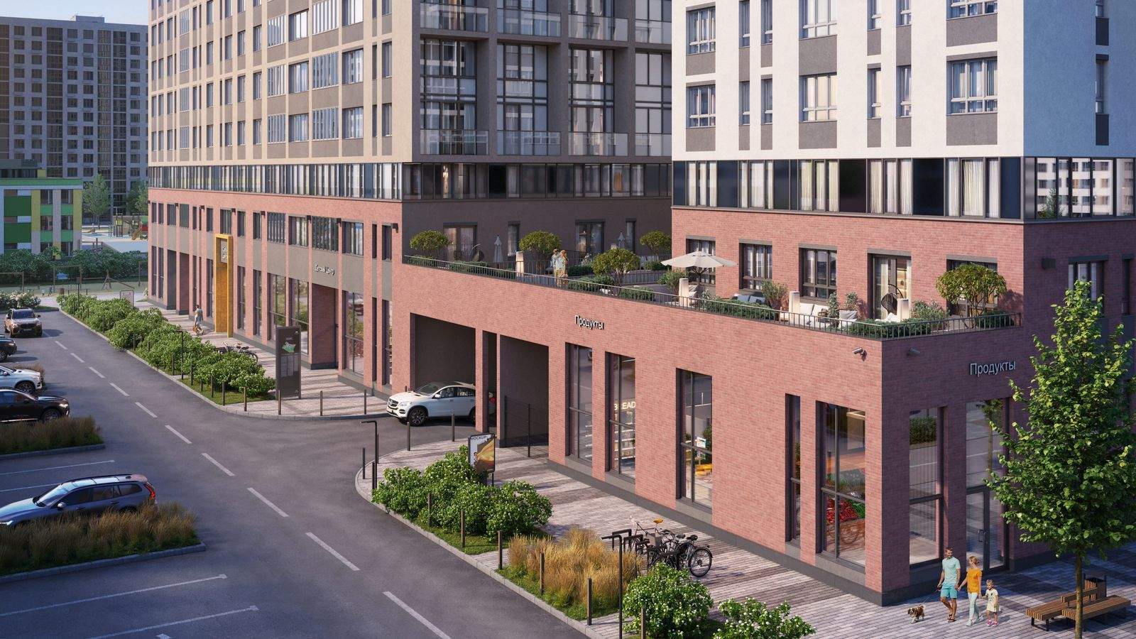 Для автомобилей выделены зоны наземной гостевой парковки и подземный паркинг с доступом на лифте в доме.