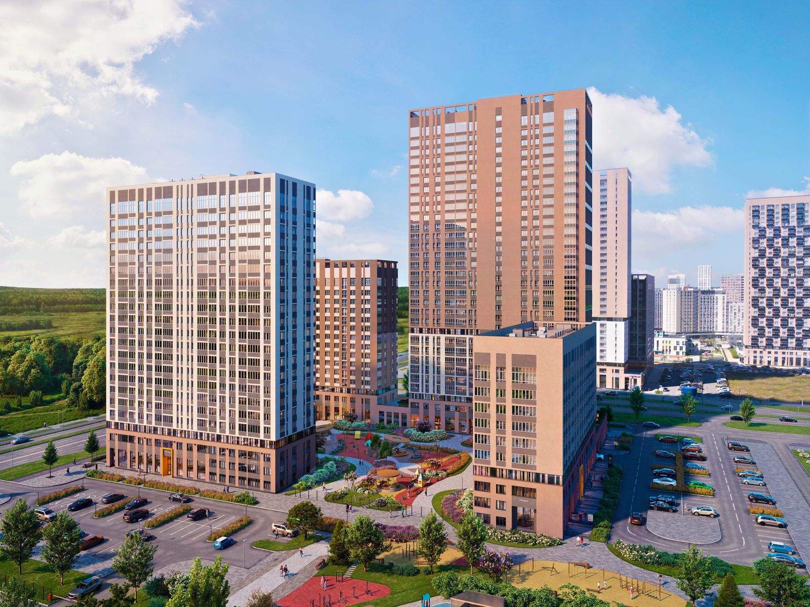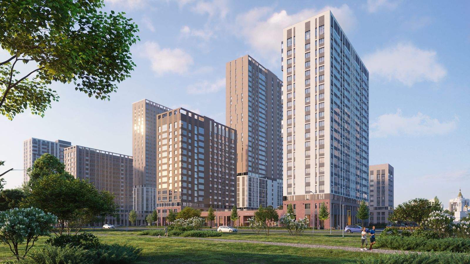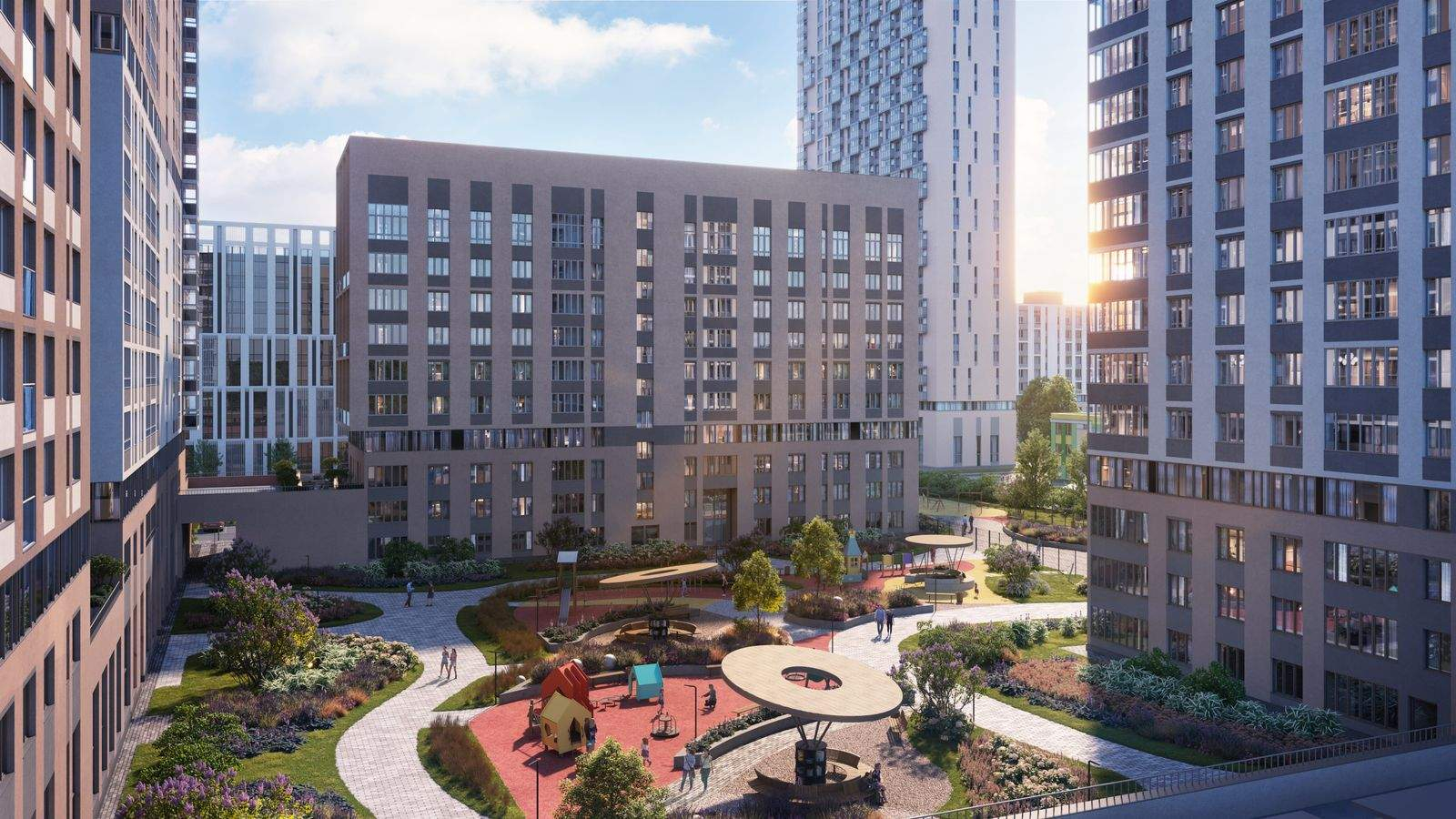 Четыре секции разной этажности ЖК First образуют закрытую дворовую территорию, обеспечивая комфорт и безопасность. Ландшафтное озеленение создаст атмосферу уюта, а живые изгороди отделят детскую зону от зоны отдыха с кроссбукингом. Благодаря переменной высотности от 10 до 32 этажей во дворе всегда много солнечного света. В проекте предусмотрены детские игровые комплексы по возрастам, места для отдыха всей семьей и занятий спортом.
