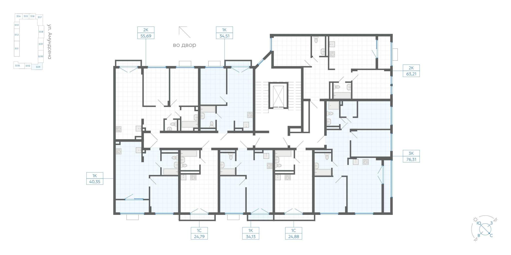 Квартира располагается на 3 этаже 4-этажного дома в ЖК Центральный парк.