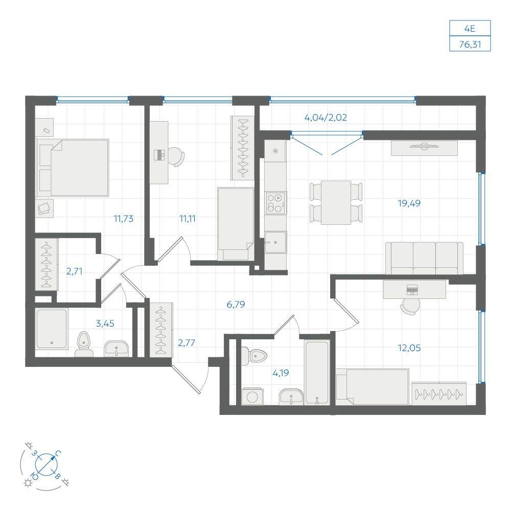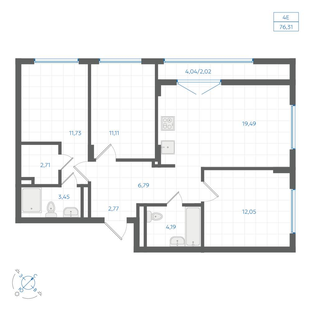 Продам трехкомнатную квартиру в новостройке 76.3 м.кв.